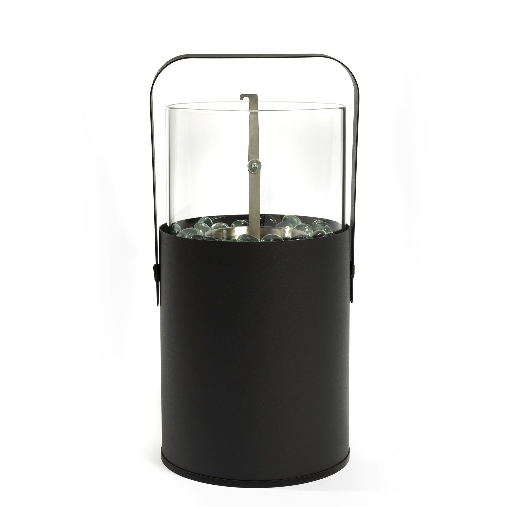 Tabletop Fire Pit, This simple and elegant portable fire pit features a durable metal base and clear glass hurricane