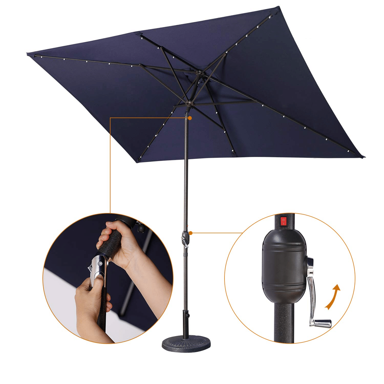 Waterproof Rectangular Patio Umbrella and Solar Lights 6.5 ft. x 10 ft. , 26 LED lights, Push Button Tilt, Crank in NAVY BLUE Waterproof Rectangular Patio Umbrella and Solar Lights 6.5 ft. x 10 ft. , 26 LED lights, Push Button Tilt, Crank in NAVY BLUE Waterproof Rectangular Patio Umbrella and Solar Lights 6.5 ft. x 10 ft. , 26 LED lights, Push Button Tilt, Crank in NAVY BLUE