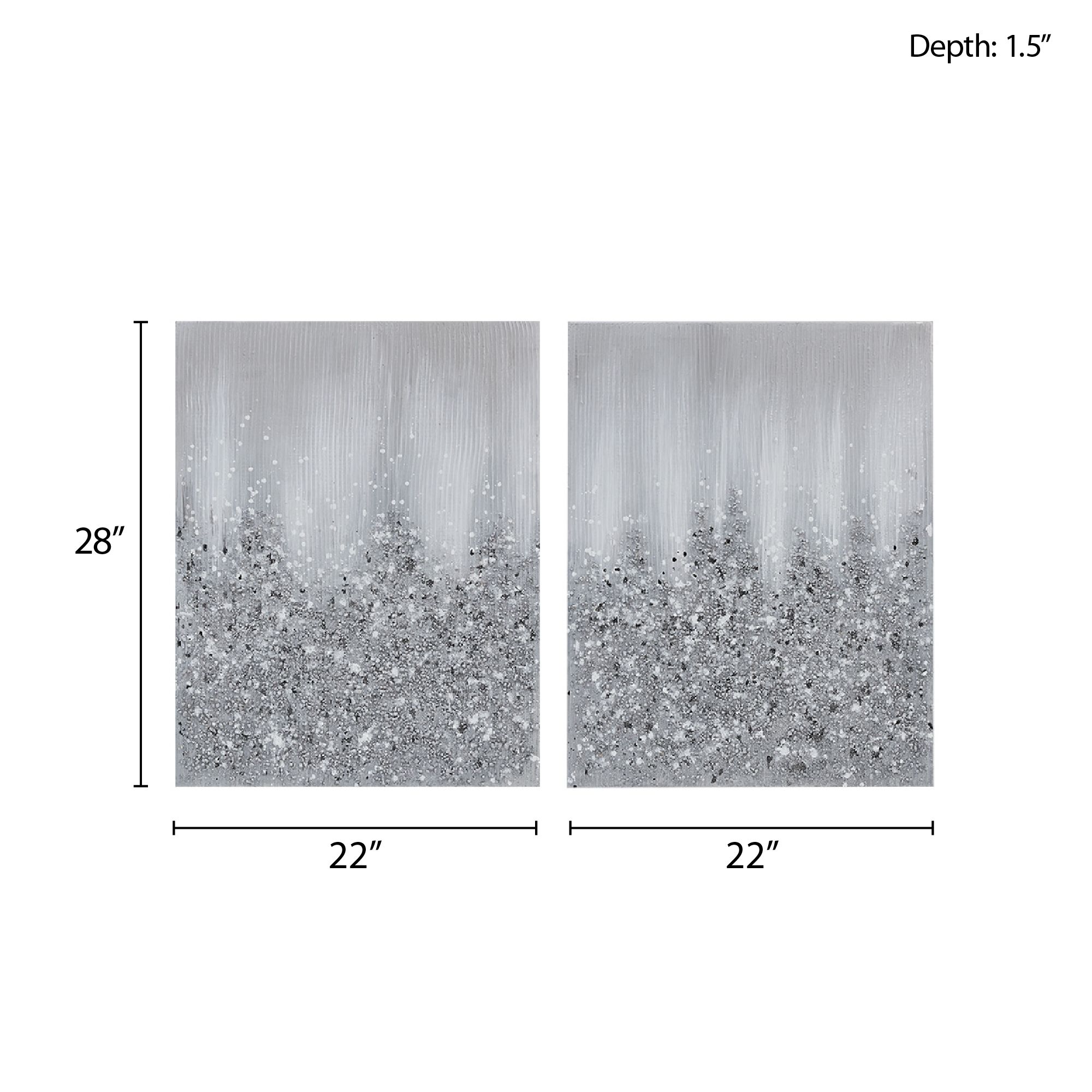 The Madison Park Glimmer Heavily Embellished 2-piece Canvas Wall Art Set brings a touch of glam to your home decor. This 2 piece canvas wall art set features a gradient abstract design in metallic hues for a striking modern look. 100% hand-brushed with real rock and stone embellishments add texture and dimension, while the silver glitter finish adds a beautiful sheen and luster. Each piece is finished with a cardboard backing for additional structure and 2 D-rings on the reverse making it easy to hang. Give your home a luxurious update by adding the perfect amount of sparkle, with our Madison Park Glimmer Art Piece Set. Due to hand embellishment of natural rock and stone; colors and glitz may vary slightly from image making each piece unique. Spot clean only; this set includes two pieces with each piece measuring 22x28".