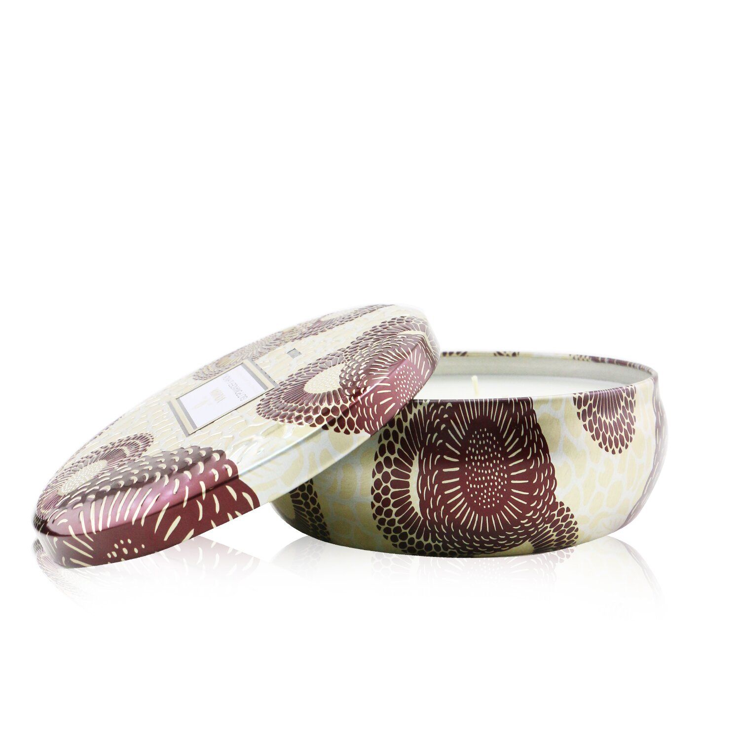 A highly decorative, heavenly-scented tin candle Made with proprietary coconut wax blend with three cotton wicks Warms your space with a soft, inviting fragrance Dimensions: 5.31" D x 2.36" H Burn time is approximately 40 hours Housed in a beautifully patterned metallic tin adorned with rich jewel tones Hand-poured in the U.S.A. Free of phthalates, parabens, sulfates & animal testing Caution: Burn on a heat resistant surface. Do not drop foreign matter or wick-trimmings into candle. Burn in an open area away from drafts. Keep candle burning within sight. Keep out of reach of children & pets