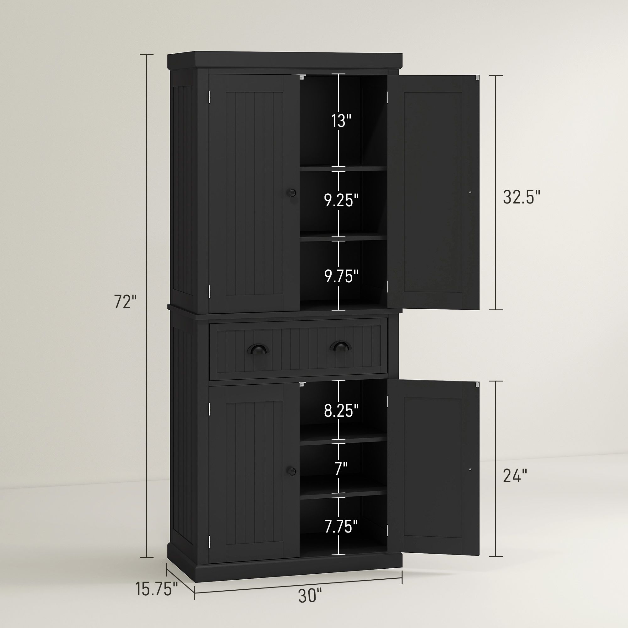 1.- Ample Space: The freestanding pantry has large space with a silent, easy-gliding drawer and two large cabinets with magnetic closure doors, making it suitable for storing various household items such as silverware, knick-knacks, towels, cookware, etc