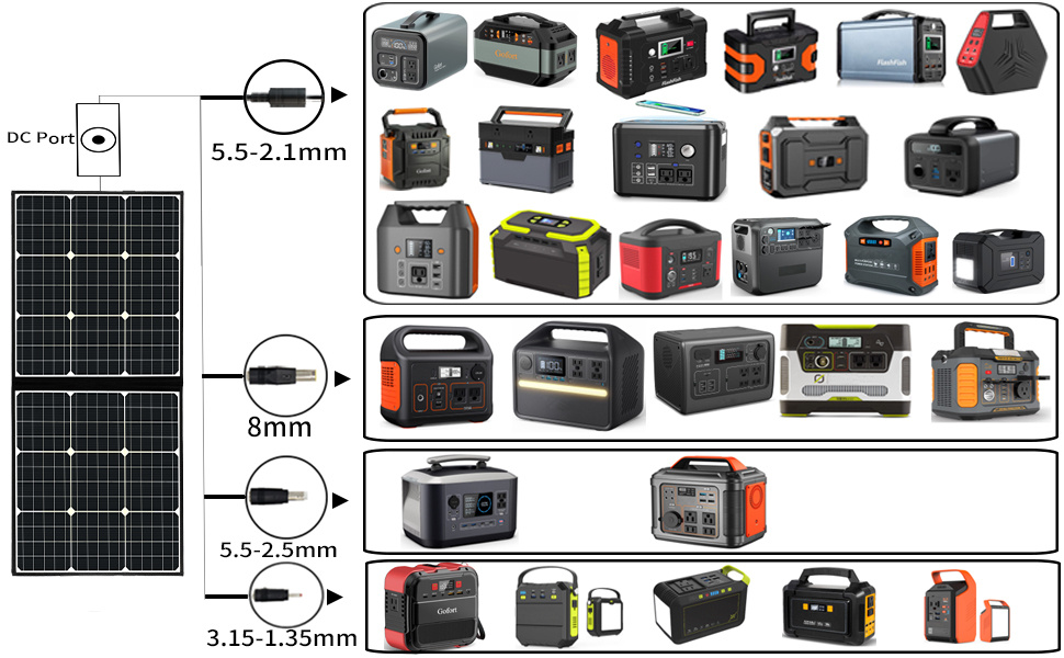 5.5 * 2.1mm DC Adapter for Gofort 200W/330W/600W/1200W; FlashFish 150W/200W/300W; Enginstar R150/R300/R350; GOOLOO P300/P600; ZeroKor; BLUETTI AC200MAX; Anker PowerHouse 200; ALLPOWERS S500/S700/Source; MARBERO 222Wh; ALLWEI 300W; Nexpow YP-300W; AIMTOM SPS-155 portable generator.8mm DC Adapter for Jackery Explorer 160/240/300/500/1000/1500; Anker 521/535/545/Powerhouse II 300/400; Goal Zero Yeti 150/200X/400/500X; BLUETTI EB55/EB70S; BALDR 330W portable generator.3.5 * 1.35mm DC Adapter for Gofort A101; MARBERO 83Wh/167Wh/88Wh; Takki 83Wh portable generator.5.5 * 2.5mm DC Adapter for Suaoki 400Wh portable generator; BigBlue Cellpowa500; VTONCE P302 portable generator.Ideal for outdoor activities such as camping; climbing; hiking; picnic; fishing; rv van trip; etc.