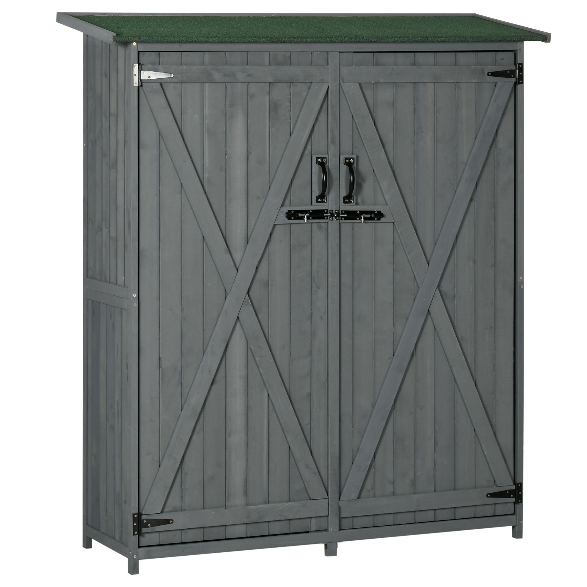 Transform your cluttered garage with our outdoor storage cabinet, an great solution for organizing garden tools, stepladders, and patio furniture. Featuring four shelves, this tool shed offers ample space for various items, ensuring neatness. Constructed from solid fir wood with an asphalt felt roof, it includes a double handle and lock, providing resilience against harsh weather and enhancing usability.